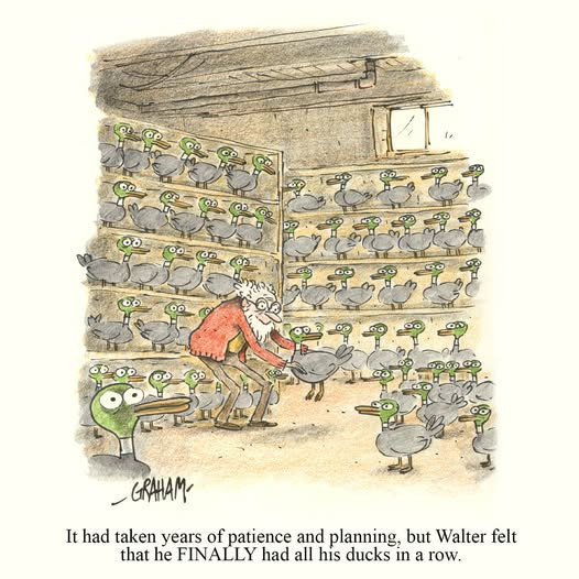 Generally with the phrase “put one’s ducks in a row” I have always imagined mid-20th century ornaments on a suburban lounge room wall: of three ducks, usually mallards, often ceramic, increasing in size, in a row, and in flight, as if migrating.